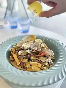 盘子里盛满了蛤蜊🦪,还有一些小番茄、蘑菇、培根和葱花。味道清新开胃,宽面劲道十足,很好地吸收了酱汁。这道菜海鲜味浓郁,带着淡淡的培根咸香,味道非常均衡,相当不错😋