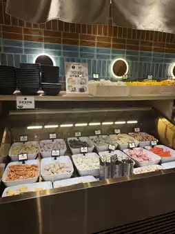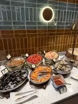 除了和牛,还有丰富的海鲜选择,比如虾、鲍鱼、扇贝、牡蛎和蛤蜊,都非常新鲜!其他火锅配料也十分齐全,包括蔬菜、熟食、开胃菜和冰淇淋——应有尽有!这里还有无限畅饮的啤酒和其他饮料,真是太爽了!