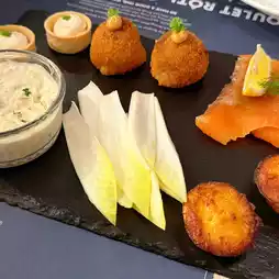 法式 小食拼盘包括蟹肉丸、烟熏三文鱼、迷你蛋挞、香草芝士挞和蘸酱竹笋——非常丰盛! 我最喜欢的是蟹肉丸,蟹肉满满,外酥里嫩。主菜是香煎三文鱼,配以大蛤蜊、烤茴香和海鲜烩饭底。澳洲和牛碎牛肉配以小胡萝卜和土豆泥。牛肉用鹅肝白兰地酱腌制,带有浓郁的法式风味和独特的口感。此外,我还点了两杯饮品:一杯是带有摩洛哥风味的摩纳哥生啤,另一杯是抹茶苹果汁。这款无酒精水果杯由抹茶、青苹果、柠檬和蜂蜜制成,绝对值得一试。🛎️必尝指数:8/10🔆 📍香港将军澳唐贤街9号PopCorn 1 1楼F23铺