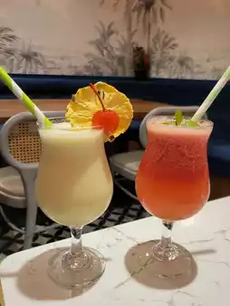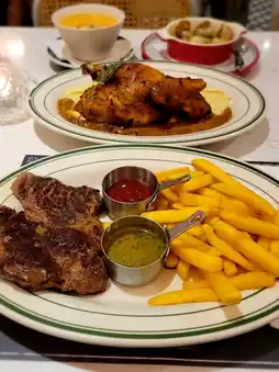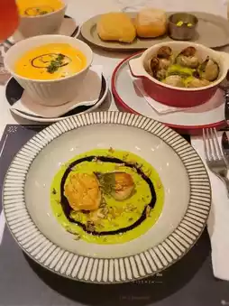 双人套餐包含汤🍲、面包🥖、两道开胃菜或甜点,以及两道主菜🐥🐄。我们还点了鸡尾酒🍹,真是太美味了!