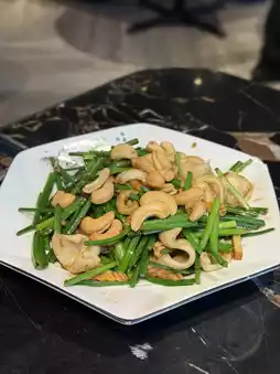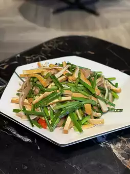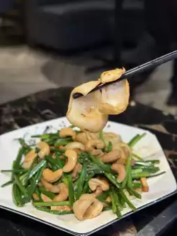 这道炒菜食材丰富,包含大块鱿鱼,搭配韭菜花、虾米、腰果、豆腐干和肉丝,大火爆炒,锅气十足!