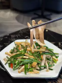 猪耳富含胶原蛋白,口感软嫩,与韭菜花、豆腐干和辣椒大火快炒,咸香酥脆,风味十足!