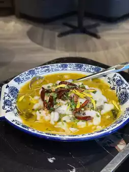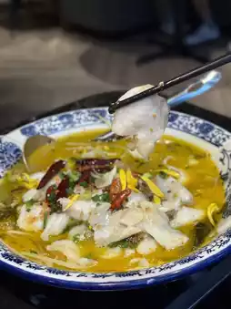 一上桌,香气扑鼻而来,四川花椒、芝麻和干辣椒淋在热油上,香气四溢,味道鲜美!鲈鱼片新鲜嫩滑,无骨,分量十足;搭配土豆粉、腌菜、豆芽、生菜梗、小白菜和豆芽,鲜美可口,令人食指大动。