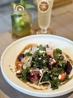 Visually stunning, colorful like a work of art! Slices of dual-tone purple-red beetroot laid out like petals at the base, topped with vibrant green salad sprinkled with crunchy quinoa and dried cranberries, glistening after being drizzled with aged vinegar dressing~ The kale is fresh and crisp, the beetroot sweet and juicy, the cheese salty and creamy, the crunchy quinoa adds texture, and the tangy vinegar dressing ties it all together—healthy and delicious!