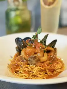 The sauce coats the chewy noodles thoroughly, with prawns, mussels, and squid piled high. The spiciness is mild but powerful, the seafood fresh and sweet, the sauce rich with a tangy tomato aroma, and the noodles hold the sauce perfectly. Delicious, I absolutely love it💕