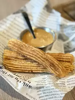 Golden and crispy Spanish churros dusted with cinnamon sugar, served with a plate of thick caramel milk sauce. Crispy on the outside, soft inside, the sweetness of caramel blends with the spiciness of cinnamon, and you can even hear the "crack" when you bite into it—pure bliss!