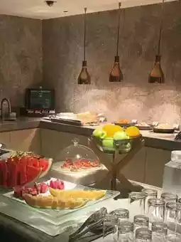 餐厅提供丰盛的自助早餐,汇聚全球美食,并设有现场烹饪台。