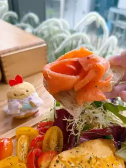 我点了咖啡馆的招牌全天早餐❤️ 内容非常丰富😚 包括慢炖鸡胸肉、烟熏三文鱼、蘑菇、小番茄、炒蛋、沙拉蔬菜等等😍 色彩缤纷的摆盘让人心情愉悦🥰 食材非常新鲜,简单的调味突出了食材本身的鲜美👍 绝对超赞❤️
