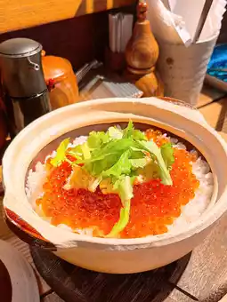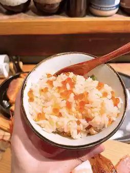 米饭煮好后,加入三文鱼和三文鱼籽。