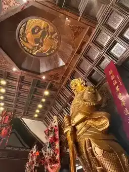 庙里有一尊巨大的车公像,他是中国古代一位传奇将军。人们相信车公能辟邪、带来好运,所以很多人来这里祈求事业和财运亨通。