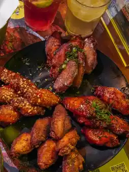 这款炸鸡拼盘选用无激素鸡翅,低温慢煮后立即油炸,外酥里嫩,