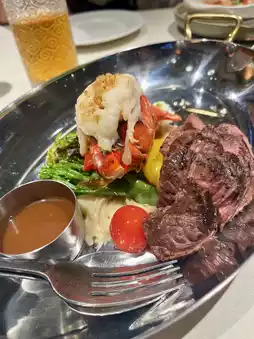 西冷牛排烹制至七分熟,中心呈粉红色,外皮酥脆,内里鲜嫩多汁。龙虾尾口感劲道,搭配绵软的土豆泥和甜芦笋。