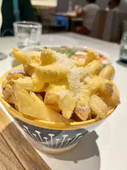 薯条金黄酥脆,淋上三重融化的芝士,奶香浓郁。