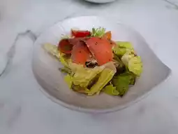 这道开胃菜很诱人,烟熏三文鱼咸度适中,香气扑鼻,搭配新鲜的绿色沙拉叶,味道真不错~