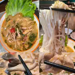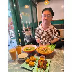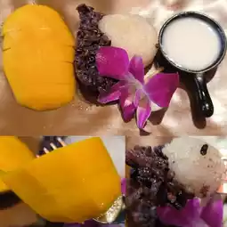 这碗冬阴功鸡汤面的分量很足,汤底选择了少辣,酸辣适中,鸡肉不柴,虾面鲜嫩多汁,搭配龙眼冰只需 $15,龙眼冰略甜。炸虾饼只需加 $38,就有 4 个大虾饼,虾饼弹牙,外皮酥脆。此外,还有一份 $18 的椰子糕,有 4 个,吃起来像蔬菜糕,上层是椰汁,下层是椰子水,甜度适中。最后,搭配一份 $38 的芒果糯米饭,糯米饭做成了红白相间的造型。心形芒果,超级甜超级多汁,点套餐记得要点小吃和甜点哦!