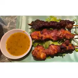 这道烤肉串可以选择猪肉、牛肉和鸡肉,我选了 2 串鸡肉和 1 串牛肉,其他泰式餐厅很少提供这种选择。这 3 串烤得恰到好处,不会烤得太干。你还可以点泰式沙爹酱,这款沙爹酱带有一点花生酱的味道!