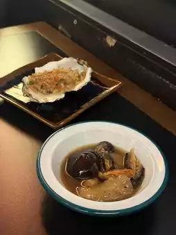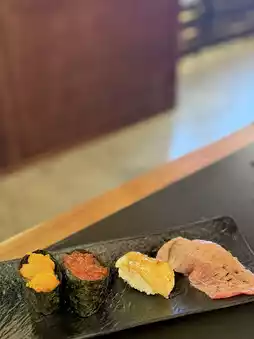 首先是和牛寿司和寿喜烧,油脂分布均匀,入口即化,油香四溢。喜欢寿喜烧的朋友,牛肉鲜嫩多汁,搭配甜美的寿喜烧酱汁,味道绝佳!