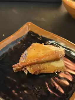 和牛鱼子酱海苔可颂,这搭配简直绝了!和牛的油润鲜香,鱼子酱的咸鲜,海苔的清爽,再加上酥脆的可颂,味道相当不错!还有烤乳鸽!皮脆肉嫩!