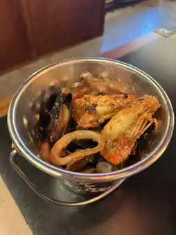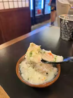 海鲜筒也十分诱人,里面盛满了虾、培根、鱿鱼、贻贝等各种海鲜。这里还有热乎乎的蟹粥,鲜美无比。