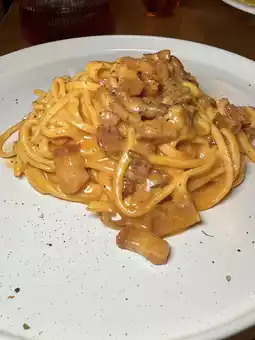 口感完美的手工意面搭配分量十足的烟熏培根。浓郁鲜美的酱汁简直是人间美味——太好吃了!