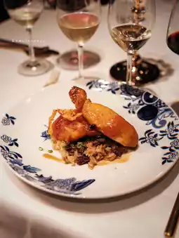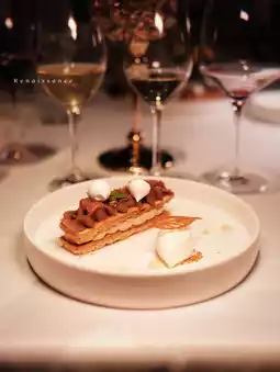 鸡皮酥脆不油腻,鸡肉鲜嫩多汁。这道鸡肉搭配羊肚菌和野生蘑菇,选用2-青味噌晒干鸡油烹制,并带有浓郁的野生蘑菇风味。🍷