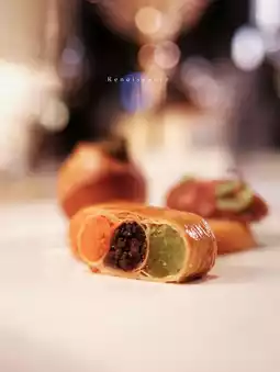 栗子千层酥。栗子千层酥——金黄酥脆的外皮,内馅是顺滑绵密的栗子馅。甜度恰到好处,不会过甜。搭配酥脆的蛋白霜和本地品牌九龙味记牛奶。