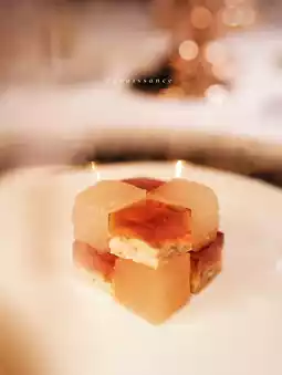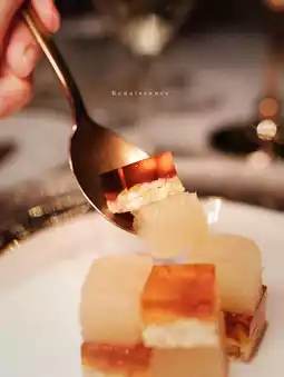 醉鸡冻配花雕酒、蜜饯梅子和冬瓜 - 这款立方体形状的醉鸡冻摆盘精致。鸡皮酥脆鲜嫩,散发着浓郁的花雕酒香气,却又不至于过于浓烈。蜜饯梅子和冬瓜带来清爽、甜咸交融的口感,每一口都能感受到酒香、清爽和酸甜的完美平衡。