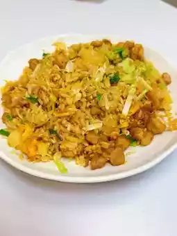 这道炒饭由菠萝块、鸡丁、虾仁、鸡蛋和什锦蔬菜制成。味道甜中带酸,每一粒米都粒粒分明,并散发着菠萝的清新果香。