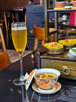 饮品方面,您可以选择招牌饮品、咖啡或茶。我选择了招牌饮品:温热的橙皮陈年蜂蜜,据说有助于消化;以及桂花绿茶苏打,以其美容和抗氧化功效而闻名。