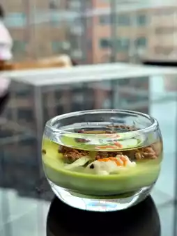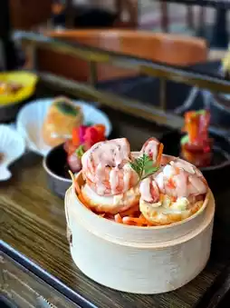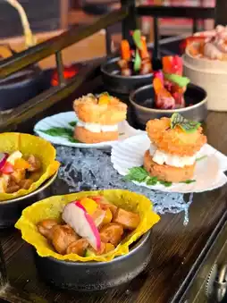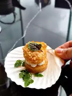 咸味菜品方面,香脆扇贝配芒果酱是不错的选择。新鲜的扇贝炸至金黄酥脆,内里却依然鲜嫩多汁。搭配土豆沙拉底和用新鲜菲律宾芒果和醋调制的酱汁,酸甜可口,风味绝佳。