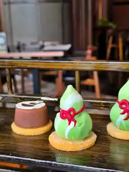 另一道适合拍照的甜点是抹茶布丁配樱桃利口酒冻,造型宛如一个迷你鱼塘。浓郁的宇治抹茶布丁与顶部的果冻完美搭配,更添一丝绵长的甜味。可食用的瑞士甜菜叶点缀成水生植物,巧克力金鱼和黑巧克力石——罐子里的所有元素均可食用,带来趣味十足的甜点体验。
