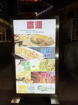 主打菜品有蚝、潮州虾、脆皮鸡、油鸭腿锅、回锅肉、炖鹅、双冬羊锅,海鲜和肉类应有尽有,白天在灯光下色泽更加诱人!