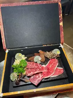 盛盘甚至设计成一本书,现场点亮,宛如一本魔法书,将各种野生菌菇和鲜嫩的和牛再次呈现在眼前!野生菌菇营养价值高,在香港较为稀有。和牛牛肉鲜嫩多汁
