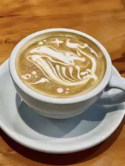 ⚪️ 加了一杯热拿铁(+25港币)——拉花也令人惊喜。这次我抽到了一条鲸鱼🐋☕——真是个可爱的小惊喜!