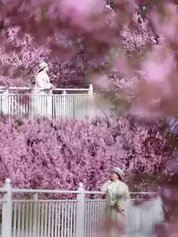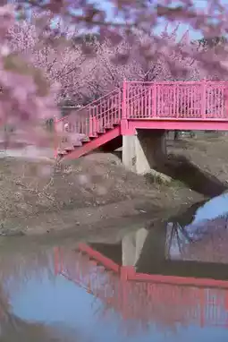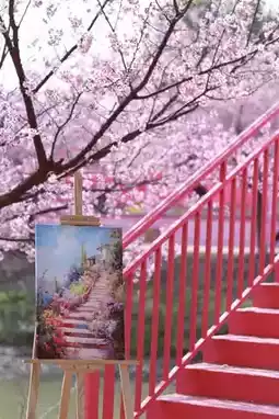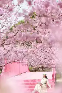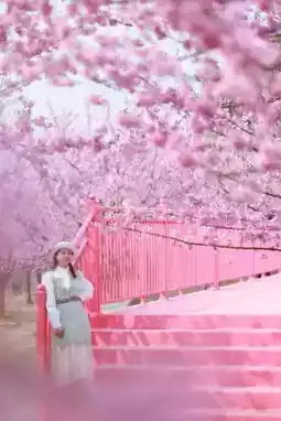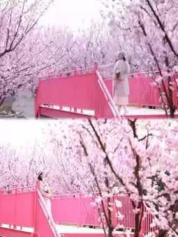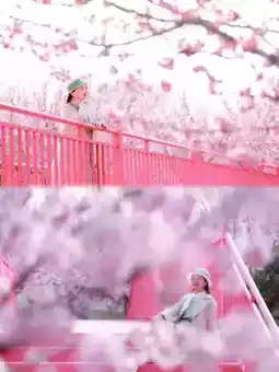 3⃣粉色桥:虽然粉色看起来有点俗气,但却出奇地上镜,尤其是连接樱花岛的那座。以桥两侧的樱花为前景和背景,站在桥上或坐在引桥的台阶上,都充满了粉嫩浪漫的气息。