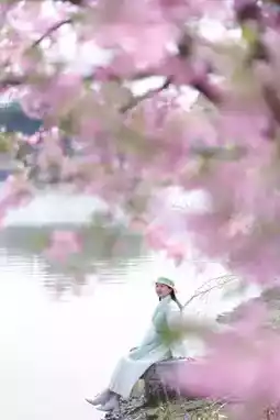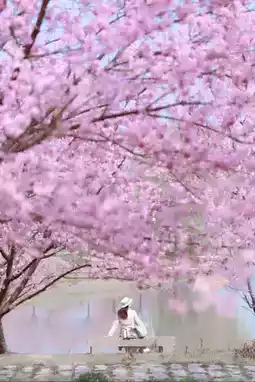 5⃣ 绿意盎然的湖畔:坐在湖边,以湖光山色为背景,樱花盛开为前景,俯瞰美景。湖面倒映着樱花和蓝天,宛如一幅清新雅致的画卷。