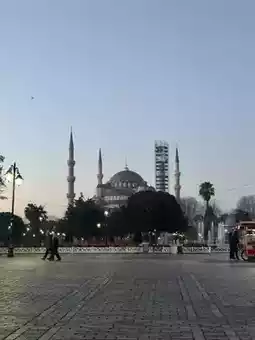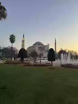 柔和的金光洒满天空,温暖的光芒笼罩着两座静谧的宏伟清真寺。高耸的宣礼塔直插粉彩般的晨曦,精巧的穹顶映照着初升的阳光。两座清真寺之间,静谧的庭院闪烁着露珠,柔和的影子在光滑的大理石地面上舞动。鸟儿在头顶翱翔,它们的身影在冉冉升起的太阳映衬下显得格外轻盈,世界在宁静与敬畏中缓缓苏醒。#清真寺之旅 #伊斯坦布尔 #圣索菲亚大教堂 #蓝色清真寺