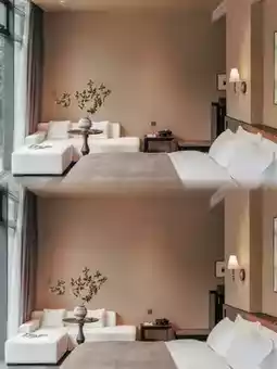 客房采用现代中式风格,实木家具搭配亚麻床品,配备智能马桶和高速无线网络,既优雅又便捷。打开窗户,映入眼帘的是庭院美景,清晨在鸟鸣声中醒来,在茶室里品茗茯梁茶,下午可以去附近的陶艺工作室体验陶艺的乐趣——即使是初学者也能玩得不亦乐乎~ 酒店