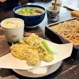 庵 这家荞麦面店在谷歌地图上评价很高。我点了季节限定的生蚝天妇罗(冷荞麦面),朋友点了鸭肉荞麦面(热荞麦面)。