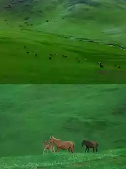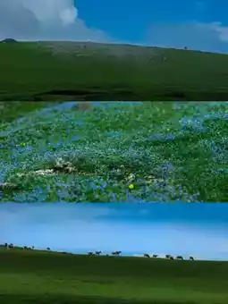牛羊点缀着草地,低角度拍摄,配上蓝天白云,营造出一种吉卜力动画般的氛围。------