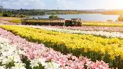 💐 亮点:距离昆明仅1.5小时车程,十万株百合花正值盛花期,粉色、白色和黄色的花朵交织成一片壮丽的花海。游客可以登上观景台,饱览花海和太平湖的迷人景色,也可以乘坐观光小火车穿梭于花海之间,沉浸在芬芳和微风中,是周末度假的理想之选。