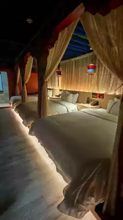 酒店的屋顶露台更是亮点所在,为您提供了一个无与伦比的观景平台。从这里眺望雄伟的布达拉宫,在蓝天白云的映衬下,宫殿的壮丽与神圣气息更加熠熠生辉。无论白天还是夜晚,从这里欣赏布达拉宫的景色都令人难忘,让您感受到历史的厚重与时光的流逝。西藏廓尔喀精品酒店以其独特的魅力,为每一位旅行者打造难忘的拉萨体验。