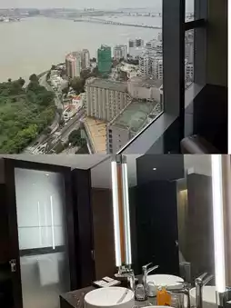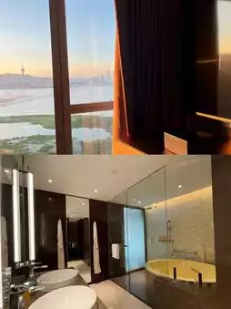 现代简约的设计风格,搭配柔和的灯光,营造出宁静的氛围,落地窗让您一眼就能欣赏到城市的繁华和海景。床品采用高品质面料,触感柔软,还配备了圆形浴缸🛁 您可以在城市漫步后享受舒适的泡澡~
