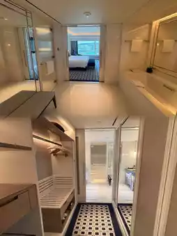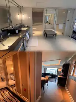 - **完美客房**:维多利亚套房从您踏入的那一刻起便令人惊艳,处处洋溢着英伦风情——复古图案地毯、真皮沙发、水晶吊灯,甚至还有一部经典的转盘电话📞。落地窗将氹仔城市美景尽收眼底,而配备Molton Brown洗浴用品的大理石浴室则让您倍感呵护,芬芳怡人。迎宾小点,如配果酱和奶油的司康饼,仿佛带您开启一段伦敦下午茶之旅。
