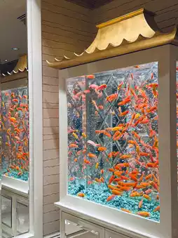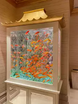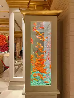 在巨大的鱼缸里,金红色的锦鲤在闪闪发光的气泡中游弋,仿佛“财富”就被封存在玻璃墙内!无论你是拍摄鱼缸的全景,还是放大捕捉鱼儿游动的身影,都能完美捕捉到那种氛围和好运📸。就连带图案的背景墙也为照片增添了美感——每一张照片都充满了好运的气息!