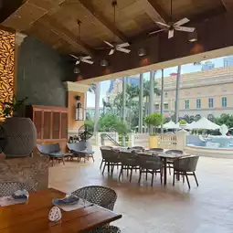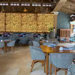 终于拍到了心心念念的小亭!一进门,就被藤椅、木桌、旋转的吊扇和棕榈树环绕,整个空间充满了南洋风情,仿佛瞬间置身海岛~🌴