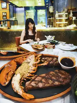 烤波士顿龙虾鲜嫩无比,肉质紧实弹牙。蒜香欧芹黄油酱汁味道浓郁却不喧宾夺主,反而增添了层次丰富的香气和风味。牛排也鲜嫩多汁。