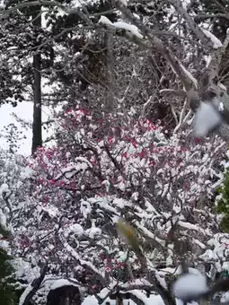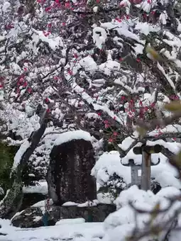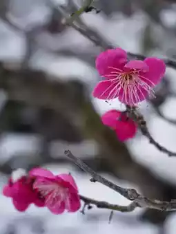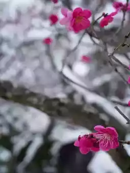 隔壁庭园里,粉白相间的梅花在雪中盛开,美极了。