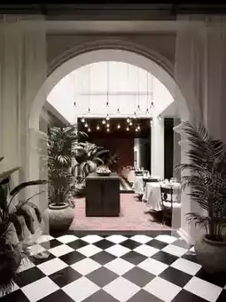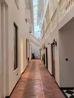 酒店内部设计令人惊艳——单色调的装饰、走廊两侧醒目的大型画作,以及摆满盆栽的郁郁葱葱的天窗。从外面看,你绝对想象不到内部空间如此宽敞美丽。