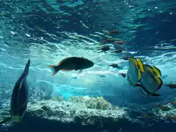 室内区域简直是海洋爱好者的天堂!🌊 其中最引人注目的是黑潮海,它如此广阔,仿佛置身于真正的海底世界。😍 在这里,你可以看到巨大的鲸鲨🐋、巨大的蝠鲼,以及成千上万的鱼群在波光粼粼、清澈见底的海水中游弋——这景象令人叹为观止,仿佛走进了一个童话世界。